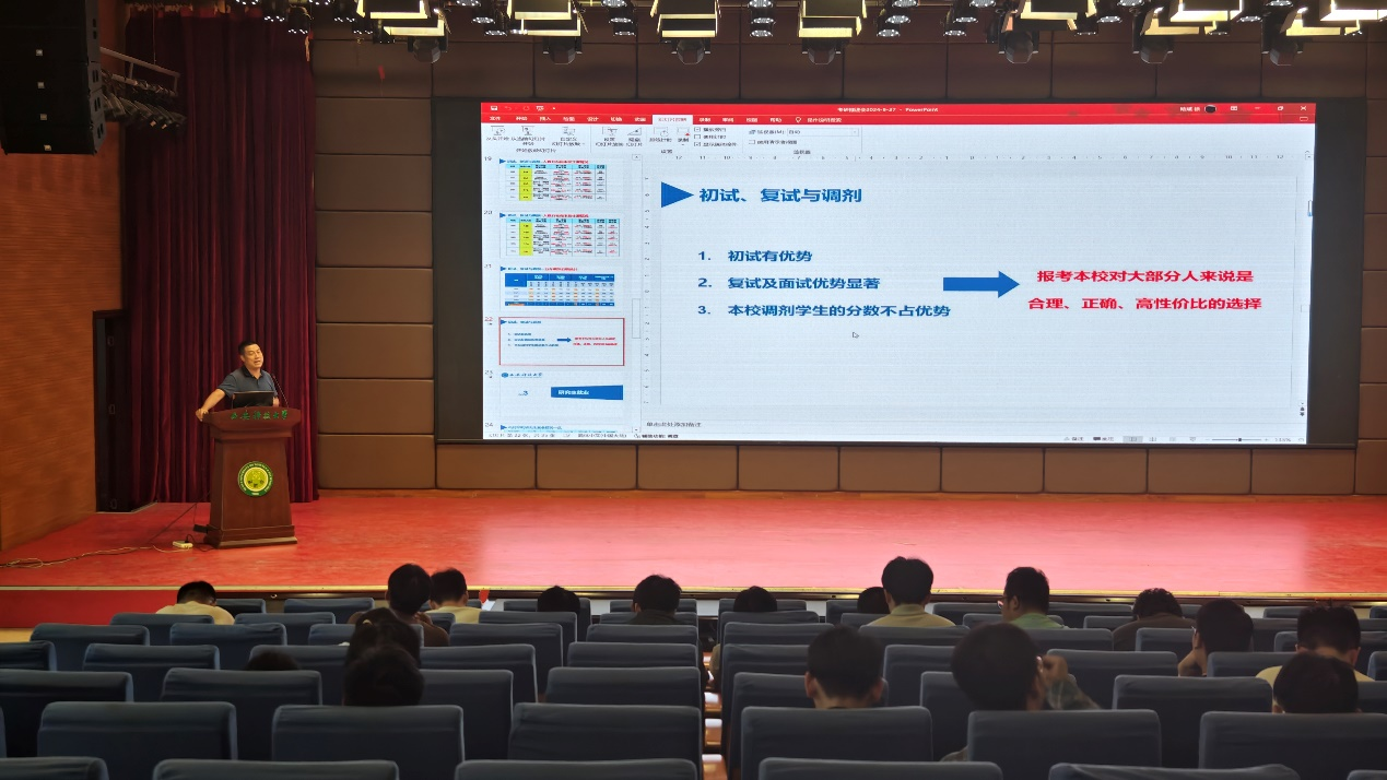 寇发荣结合目前学院考研摸排情况,介绍了学院的学科特色、专业优势,以及近几年学院考研科目设置、复试形式、往年考试招生录取情况等。秦学斌详细介绍了团队力量、科研方向、课题项目、研究生人才培养等内容。期间,几位老师与同学们进行了密切交流,鼓励同学们坚定目标、脚踏实地、砥砺前行。